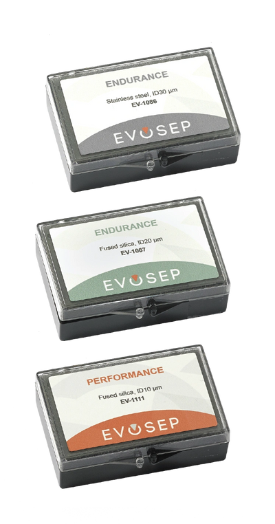 Emitters are available in Endurance and Performance versions. The default is an Endurance ID 30 µm stainless steel emitter (EV1086). The fused silica emitters are available in ID 20 µm (EV1087) and the ID 10 µm Performance version (EV1111).